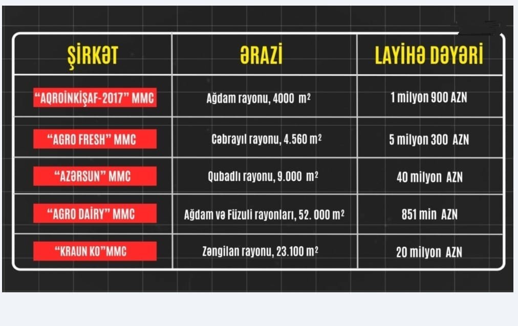 Yuxarıda sadalananlar işğaldan azad edilmiş ərazilərdə kənd təsərrüfatı ilə məşğul olmaq niyyətində olan şirkətlərin tam siyahısı deyil. Onların arasında daha beş biznes subyekti var: