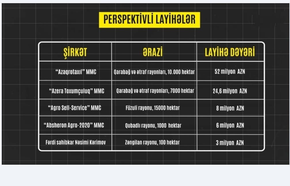 “Azera Toxumçuluq” MMC (ərazi- Qarabağ və ətraf rayonları, əkin üçün tələb etdiyi ərazi – 7000 hektar, layihənin dəyəri - 24,6 milyon manat );
