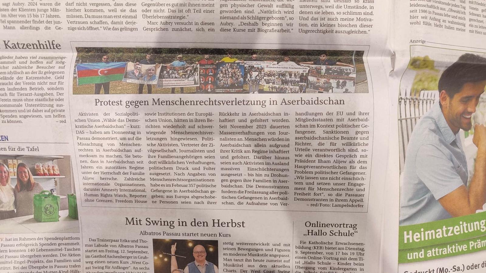 Almaniyanın Passau şəhərində sosial-siyasi birlik “Demokratik Azərbaycanı Seç” (DAS) təşkilatının fəalları cümə axşamı etiraz aksiyası keçirib. Almaniya mətbuatının diqqət yetirdiyi tədbirdə əsas mövzu Azərbaycanda insan haqlarının pozulması olub.