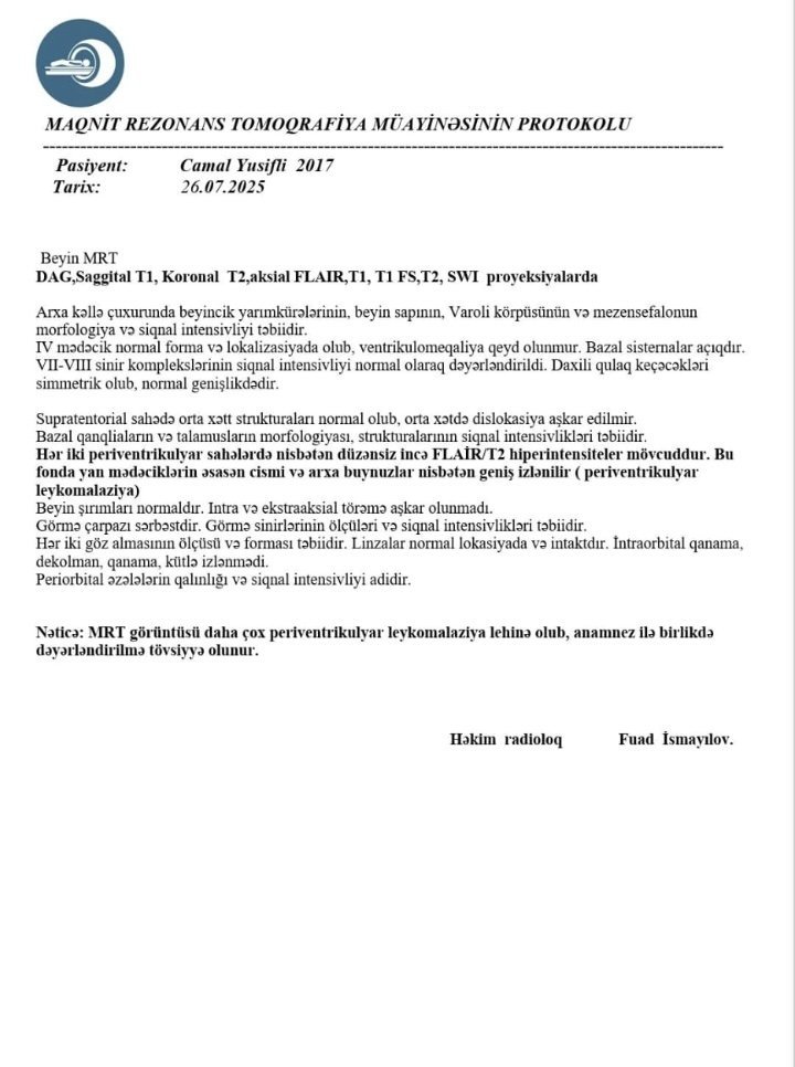 Redaksiyamıza Pəri Yusifova adlı ana müraciət edərək ağır xəstəlikdən əziyyət çəkən övladı üçün yardım istəyib. O, övladının təcili müalicə və reabilitasiyaya ehtiyacı olduğunu bildirərək yardımsevər insanlara səslənib. Ananın müraciətini olduğu kimi diqqətinizə təqdim edirik. Ümid edirik ki, xeyirxah oxucularımız bu çağırışa biganə qalmayacaq.