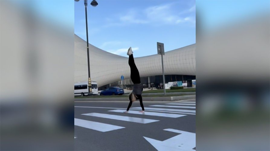 Belə ki, xanım ayaqlarını göyə qaldıraraq piyada keçidini əlləri üstə keçib.