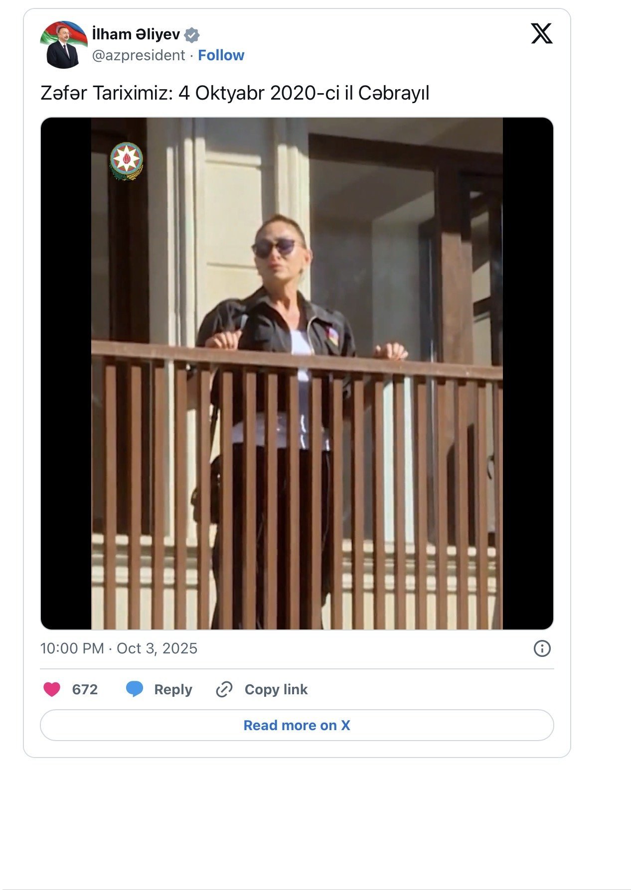 Prezident İlham Əliyev sosial şəbəkə hesabında 4 oktyabr 2020-ci ildə Cəbrayıl şəhərinin işğaldan azad edilməsinin ildönümü ilə bağlı paylaşım edib.