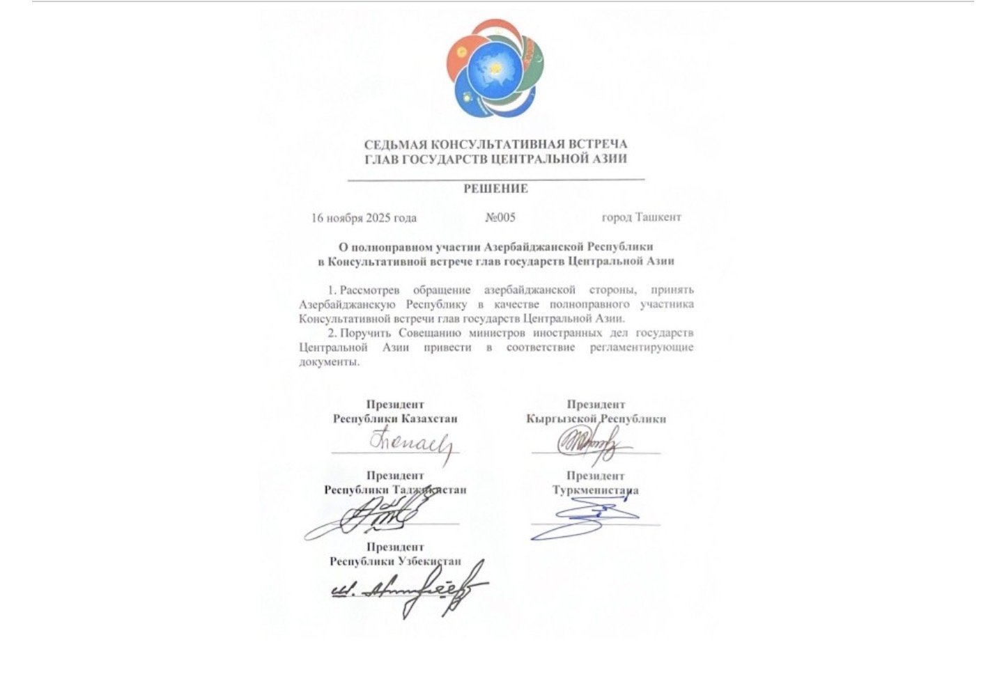 Özbəkistan Prezidenti Şavkat Mirziyoyev Mərkəzi Asiya Dövlət Başçılarının 7-ci Məşvərət Görüşündə Azərbaycanın tamhüquqlu iştirakçı qismində qoşulduğunu açıqlayıb.