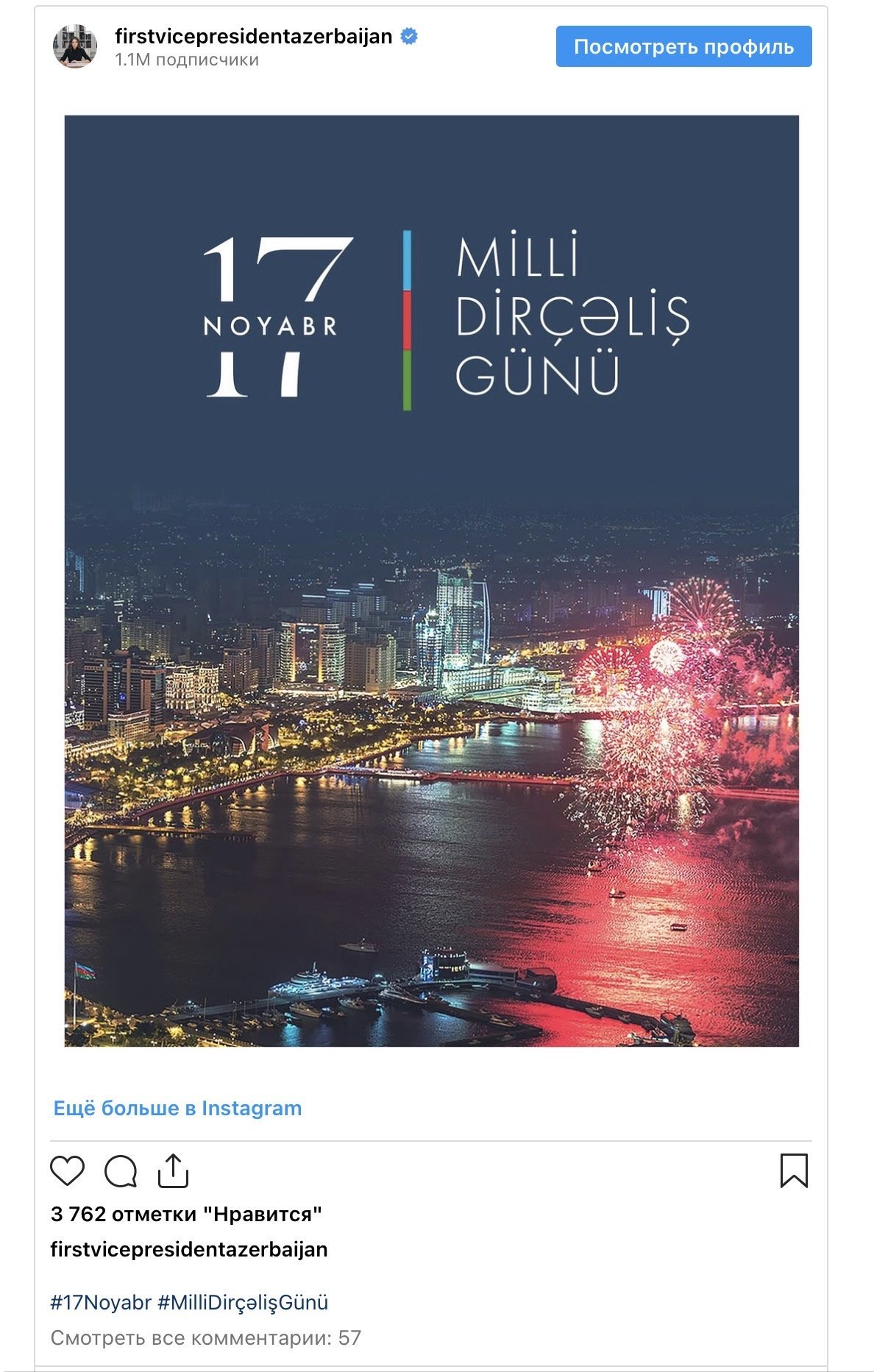 Azərbaycan Respublikasının Birinci vitse-prezidenti Mehriban Əliyeva 17 Noyabr – Milli Dirçəliş Günü münasibətilə rəsmi Instagram səhifəsində paylaşım edib.
