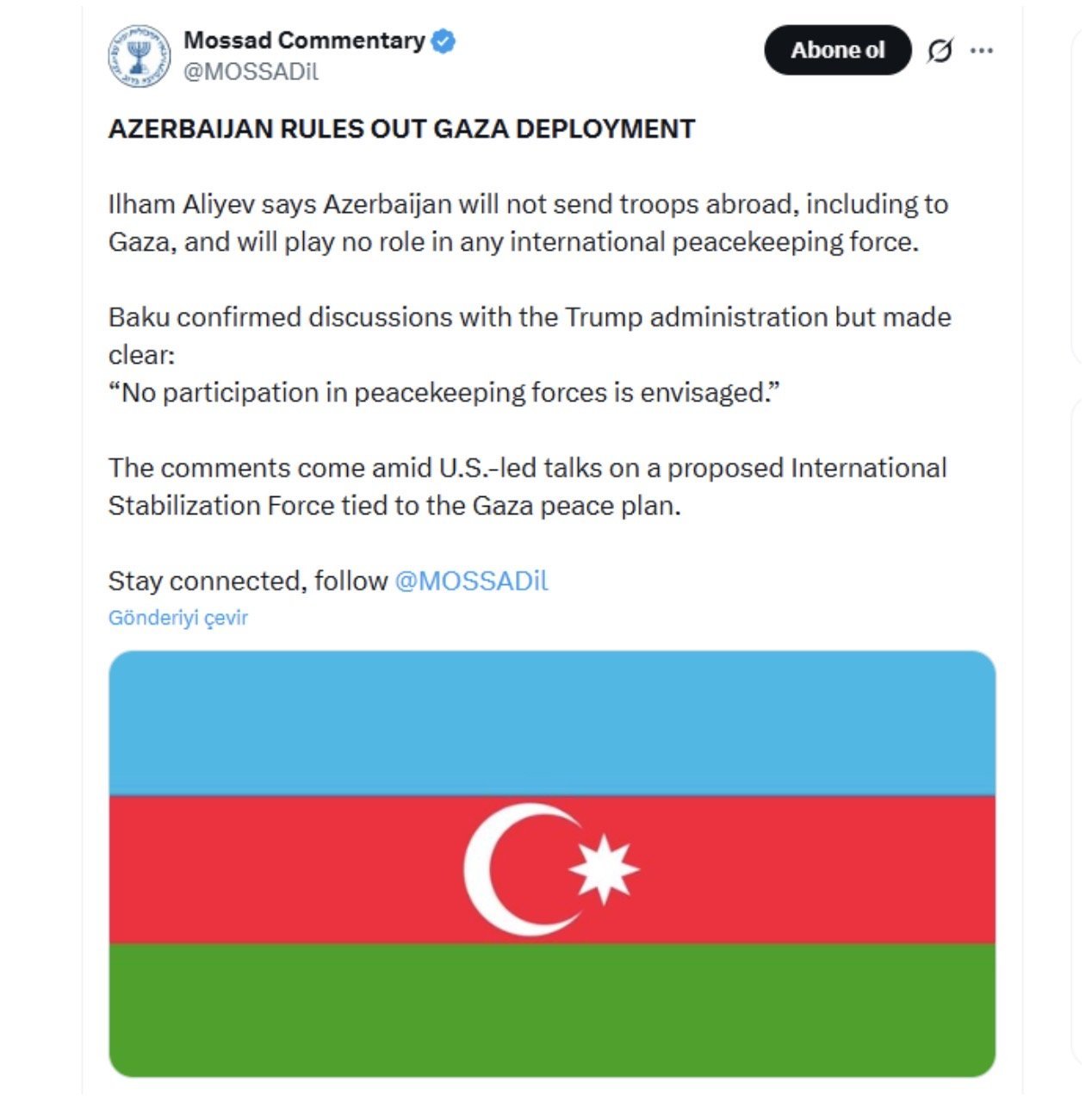 Paylaşımda bildirilib ki, Azərbaycan öz qoşunlarının Qəzza zolağına yerləşdirilməsini istisna edir. “Mossad” Azərbaycan Prezidenti İlham Əliyevin mövqeyinə istinad edərək qeyd edib ki, Bakı Qəzzaya da daxil olmaqla, xarici ölkələrə qoşun göndərmək və hər hansı beynəlxalq sülhməramlı missiyada iştirak etmək niyyətində deyil.