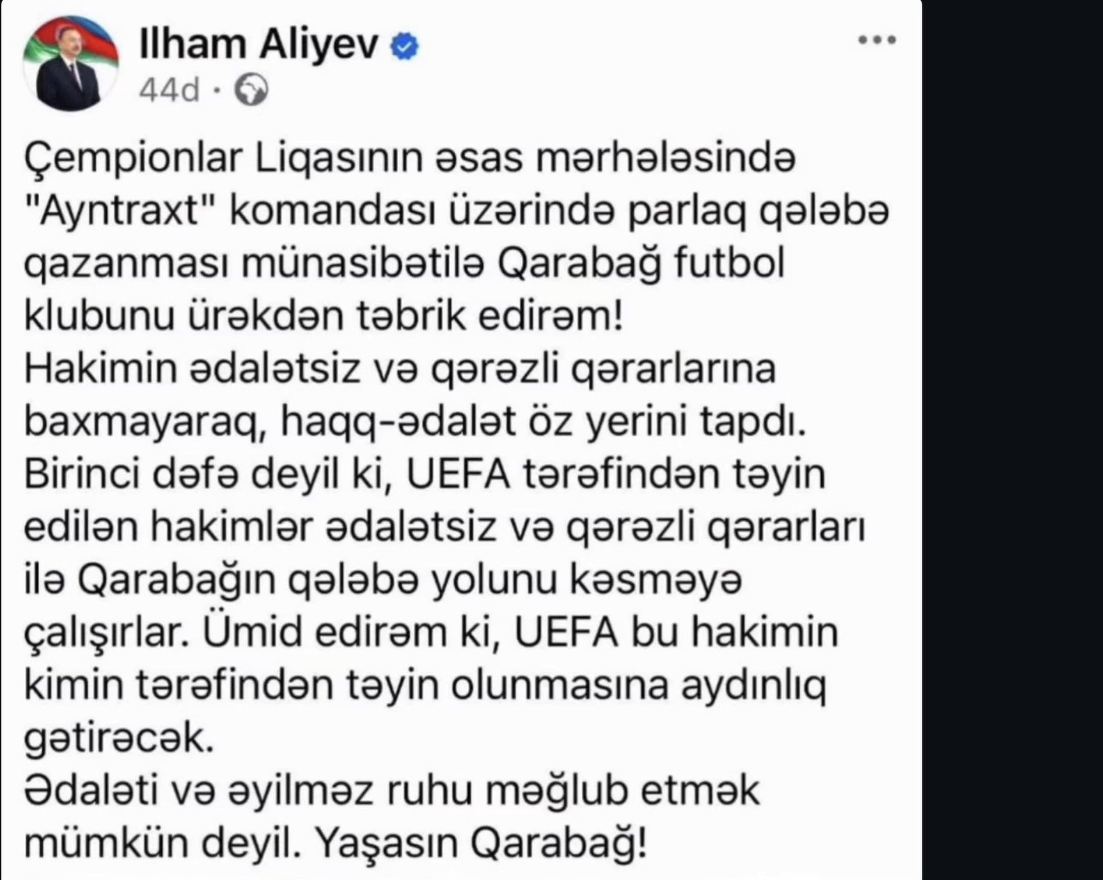 Azərbaycan Respublikasının Prezidenti İlham Əliyev Qarabağ Futbol Klubunu növbəti uğuru münasibətilə təbrik edib. Prezident təbrikində klubun ölkə futbolunun inkişafına verdiyi töhfələri və beynəlxalq arenada Azərbaycanın adını layiqincə təmsil etdiyini vurğulayıb.